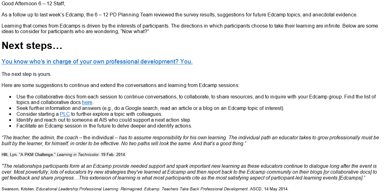 - Lastly, Christina sent out an email with suggestions to encourage staff to “continue and extend the conversations and learning from Edcamp sessions.”